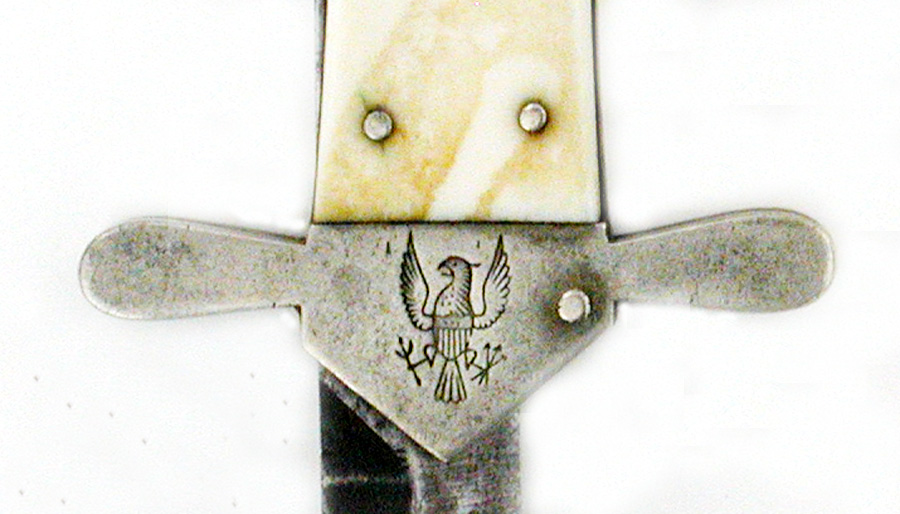 LARGE FOLDING DIRK KNIFE BY WRAGG. The slender, 10 1/2" blade marked on the left flat "MADE FOR THE UNITED STATES BY SAMUEL C. WRAGG/DIRK KNIFE MAKER No. 25 FURNACE HILL SHEFFIELD". Partial marking still visible on tang "WRAGG'S IMPROVED...". German silver bolsters with the pommel end stamped with American Eagles on both sides. The handle with ivory scales, an escutcheon plate and six proud assembly pins. Overall length when fully opened 16". Original brown leather sheath that protects the portion of the blade that remains exposed and usable when the the knife is in the folded position. Condition quite good with blade being full and with typical scattered pitting. Ivory handle slabs with small losses around some of the assembly pins(easily restored if so desired). Ex. collection Norman Flayderman. Illustrated page 66 in Rankin's "Small Arms of the Sea Services" and on page 32 in Flayderman's "The Bowie Knife, Unsheathing an American Legend".