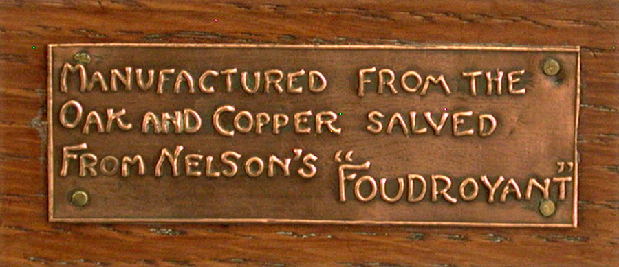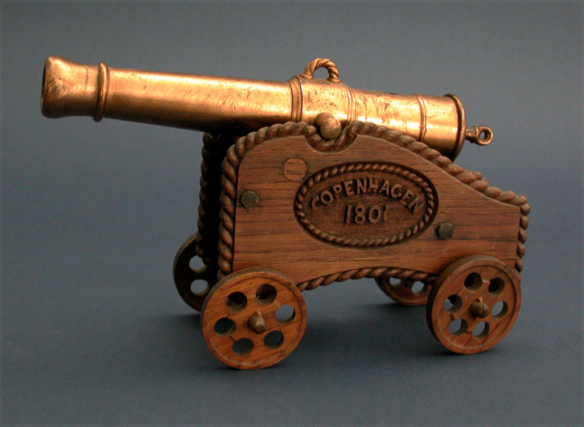 BEAUTIFULLY CRAFTED CANNON MADE FROM THE WOOD AND COPPER OF ADMIRAL NELSON"S SHIP FOUDROYANT. Nicely crafted, 11" long, copper barrel with a decorative rope twist design above the section where the trunnions protrude. The oak carriage with rope twist carving around all the edges as well as around a relief carved oval panel with inscription "COPENHAGEN/1801". The opposite side with a copper plaque with raised lettering "Manufactured From The/Oak and Copper Salved/From Nelson's Foudroyant". Overall length 12". Height 7 1/2". Condition excellent with barrel retaining its original lacquer finish. Wood carriage in original surface and excellent noting that two relief carved letters and one number have chips missing. Overall a very handsome item.