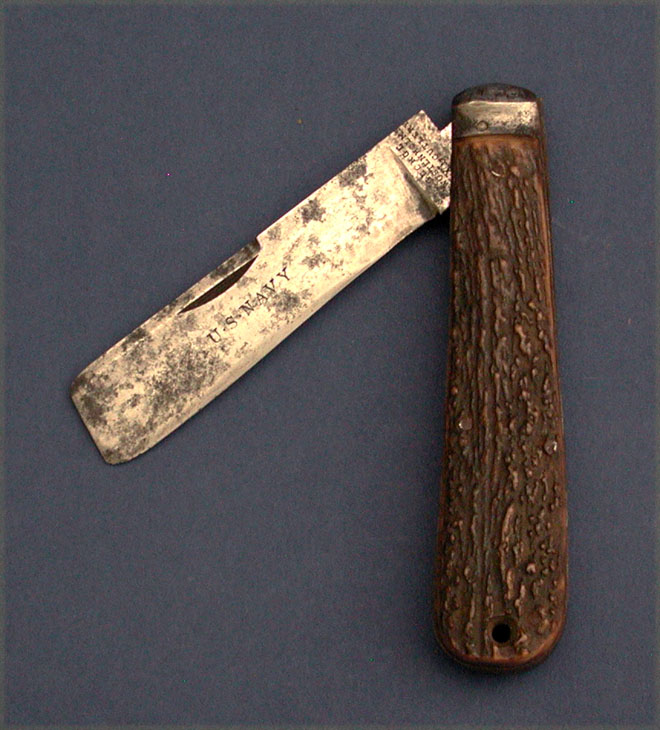 CIVIL WAR ERA U. S. NAVY ROPE KNIFE with antler slab handles. Square tipped, 4" long, blade stamped "U. S. NAVY" as well as with the maker's mark "George Wostenholm/IXL Cutlery". Overall length when open 8 1/2". Bored lanyard hole. Condition excellent having a nice full blade. These Civil War era examples quite scarce.