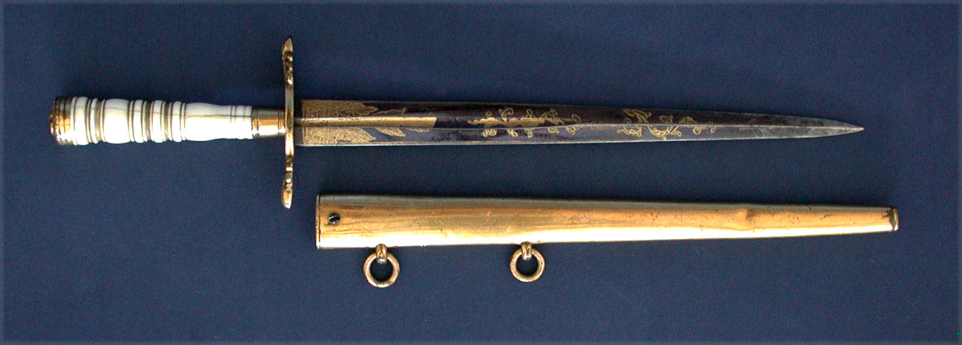 GEORGIAN NAVAL DIRK. 7 1/2" long blade with fuller in the upper half of both sides. Blade decorated with blue and gilt designs the full length of each side. 2 1/4" cross guard with attractive floral designs on each end. Turned ivory handle with gilt brass ferrule. Pommel cap with relief floral design on top. Overall length 10 1/4". Gilt brass scabbard with two carrying rings. Condition overall excellent. Circa 1790.