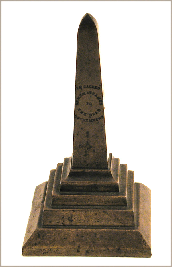 BATTLESHIP MAINE RELIC. Beautifully made, one-of-a-kind, item in the form of an obelisk shaped monument. Made using one solid piece of bronze. Each of the four sides inscribed as follows: "RELIC OF THE MAINE"; "DESTROYED FEB 15 1898"; "IN/SACRED/REMEMBRANCE/TO/THE DEAD/OF THE MAINE"; "266 KILLED". Overall height 4 1/2". Base 2.5" x 2.5". Condition fine. Great deep, mustard colored, patina. Definitely made by a highly skilled machinist.