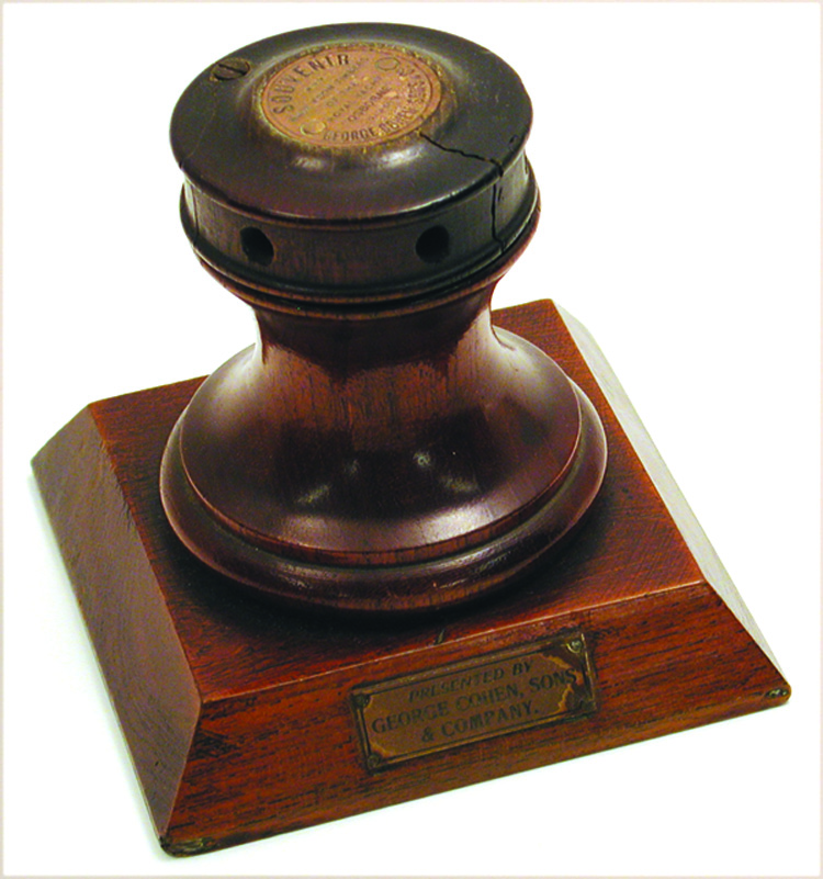 INKWELL MADE FROM TIMBER SALVAGED FROM ROYAL YACHT OSBORNE. Nicely turned in the form of a ship's capstan. Upper drumhead pivots open for access to a porcelain ink cup. Inset into the top of the cover is an engraved disc with inscription "SOUVENIR/Made from Timbers/of the Royal Yacht/OSBORNE/ George Cohen, Sons & Co". Also has a plaque affixed to the front of the beveled base "Presented By/George Cohen, Sons & Co". Capstan diameter 3". Base 4" x 4". Height 4". Condition good noting a small chip missing from the top edge of the barrel that holds the ink....barely noticeable because it's on the back and is hidden by the pivoting lid.
