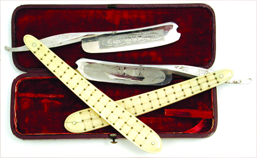 ELEGANT CASED SET OF STRAIGHT RAZORS WITH CAPTAIN AND VESSEL NAMES. Each fitted with meticulously carved ivory handles that are decorated with proud silver pins. The 5 3/4" long blades are etched one side with port view of paddle steamship "VICTORIA". Reverse of each etched within frosty panels with the name "Captain W. H. Draper". Blades also stamped with a crown over "WR" and maker's name "Joseph Rodgers & Sons/Cutler's to Their Majesties/No 6 Norfolk Street/Sheffield". Overall length when open 10". Original maroon leather storage case with red velvet interior. Condition near mint noting one small, expertly done, repair to the very tip of one of the ivory slab handles. This exact pair of razors illustrated on page 374 in Norm Flayderman's book "The Bowie Knife Unsheathing an American Legend". Beautiful quality throughout. The vessel and captain were known on the Britain to Australia route, circa 1855.