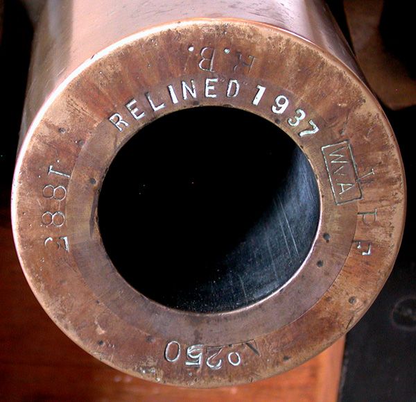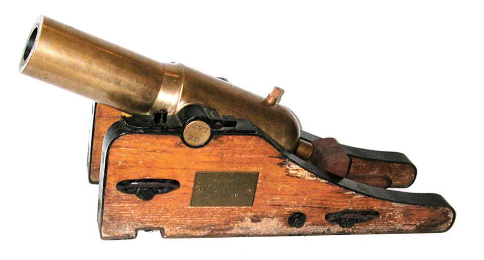 BRONZE, TYPE C, LYLE CANNON WITH LIFE SAVING SERVICE MARKINGS. A very nicely marked example with its original oak and iron carriage/sled. The muzzle stamped "1883"(year of manufacture), "WPF"(West Point Foundry), "No 250"(casting number), "Relined 1937", "WvA"(Watervilet Arsensal, did relining work), "RB"(inspector's initials, Roger Birnie). The left trunion boldly stamped "USLSS". Top of barrel stamped "DRILL GUN/MAX Charge. 4OZ". Attached to the carriage is a beveled bronze display plaque with engraved information "LYLE GUN/USED BY/U.S. COAST GUARD". Fitted with original, old style, friction primer, firing device. Heavy oak block with steps for adjusting barrel height. Condition overall excellent. A nice early example that clearly had a long history of use right through post WWII when these C guns were decommissioned.
