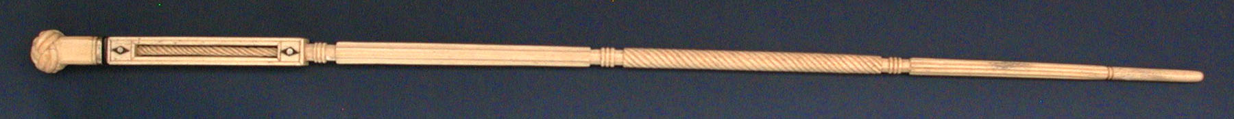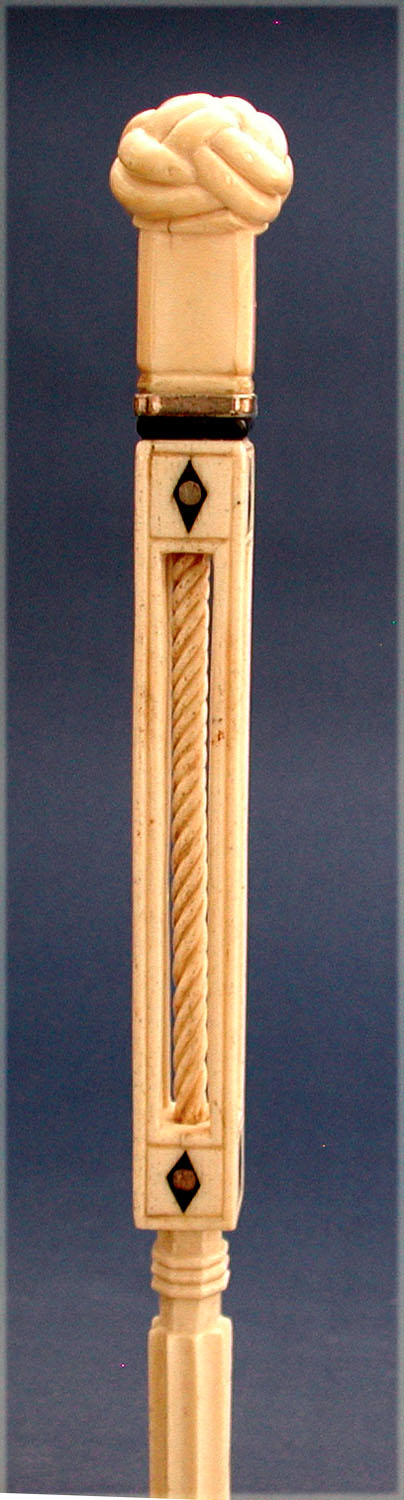 BEAUTIFULLY CRAFTED SCRIMSHAW WALKING STICK. The upper portion of the highly polished whalebone shaft done in the open, cagework motif with a rope carved column in the center. The cage is decorated above and below with silver dots within diamond shaped baleen inlays. The rest of the shaft done in seven distinct carved sections that include relief carved rings, flute and rope twist motifs and a plain tapered tip. The whale ivory knob is a carved crown knot that is attached to the shaft using two thick spacers, one made from silver and the other baleen. Overall length 36 1/2". Condition superb. Circa 1840. This is a very high grade scrimshaw cane.