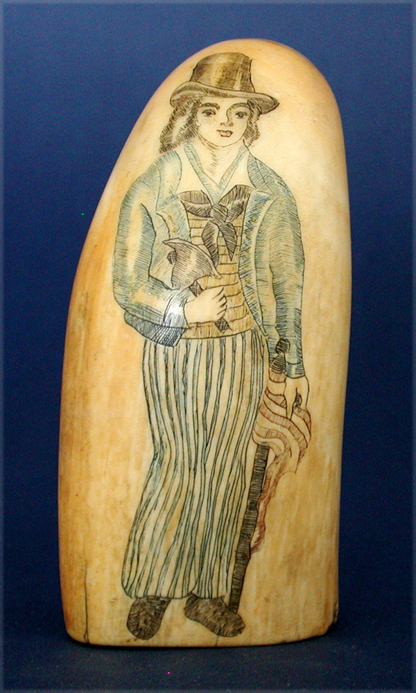 19TH CENTURY POLYCHROME TOOTH DEPICTING A YOUNG SAILOR BOY. A lovely little tooth engraved with a full standing portrait of a boy wearing his hat, sailor jacket, horizontally striped shirt and tie. His pants are vertically striped. At his left side he holds an American flag wrapped around a pole. In his right hand he clutches, what I believe to be, a short liberty pole and cap but it also could be a type of axe. All the engraving is of fine quality and nicely polychrome colored. Very thick tooth that measures 4 1/2" h. x 2 1/4" w. Condition very fine and has acquired a most desirable age patina throughout. This a a very good piece of antique scrimshaw.